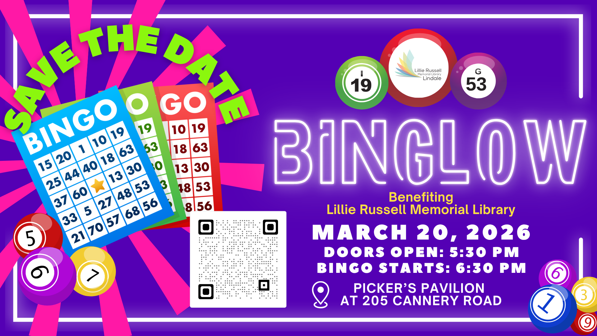 Join us on March 20, 2026, at Picker’s Pavilion (205 Cannery Row) for a night of glowing fun! Doors open at 5:00 p.m., and bingo excitement begins at 6:30 p.m.